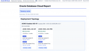 Report will display first high level topology on Exadata Infrastructure and VM Clusters.